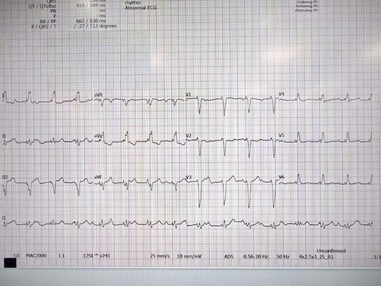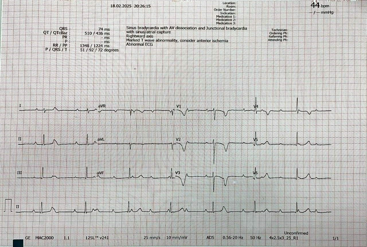 Initial 12-lead ECG demonstrated complete atrioventricular dissociation with independent atrial and ventricular activity. A narrow QRS escape rhythm was observed at approximately 44 bpm.